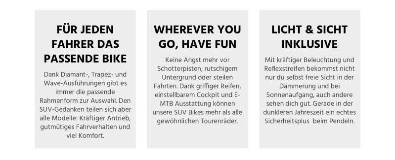 Mit unheimlich viel Komfort kommst du durch jedes Gelände – dabei auch noch mit einem Rad in sportlicher, moderner Optik und mit viel Mountainbike-DNA. Trotz des tiefen Durchstiegs haben wir mit unseren SUV-Modellen sportliche Allrounder geschaffen, die so manch anderes Bike alt aussehen lassen! Optimiert für sicheres Fahren dort, wo die Straße aufhört dank zuverlässiger Ausstattung mit großen Bremsen und griffigen Reifen sowie idealer Geometrie für sicheres, komfortables Handling. Neu: Jetzt gibt es die SUVs nicht nur als Tiefeinsteiger, sondern auch in den bekannten Trapez- und Diamantrahmenformen. Somit findet jeder das ideale Bike für sich.
